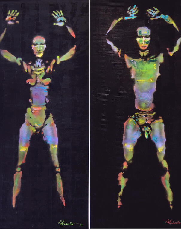 These paintings are based on TSA airport security Advanced Information Technology (AIT) body scans. These “full-body” scans are at the center of a heated debate over passenger safety and personal privacy. The AIT scans are being called intrusive and a virtual strip search.
