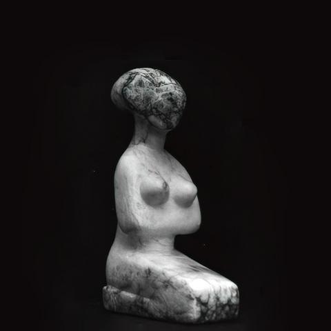 Sculpture en albâtre. Veines sombres sur tête & jambes.Avec gros chignon & bras.