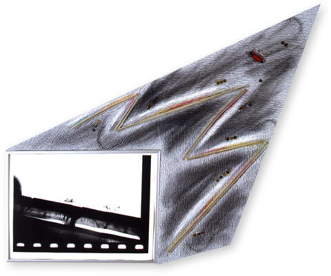 Photographie, papier abrasif, encre, pastel sec, tubes en verre, éléments de circuit informatique, le tout collé sur bois, 48 x 52 cm.