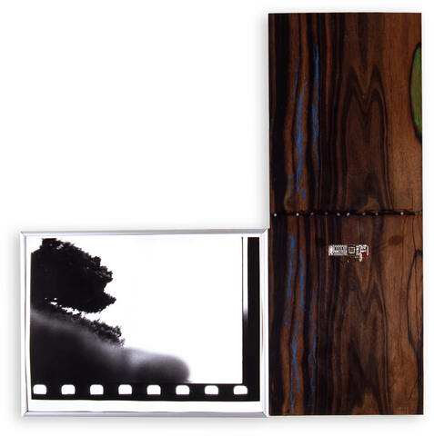 Photographie, planche de bois fin, pastel sec, éléments de circuit informatique, 44 x 44,5 cm.
