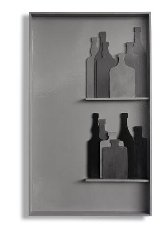 rgba(255,255,255,1) Claude GilliBouteilles et flacons — 1965Bois découpé peints et assemblés.Hauteur: 100 cm — 60 cm.© Archives Claude Gilli