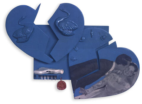 rgba(255,255,255,1) Claude GilliCoeurs brisés — 1963Bois peint et collages, 40 x 45 cm. Collection particulière.© Archives Claude Gilli