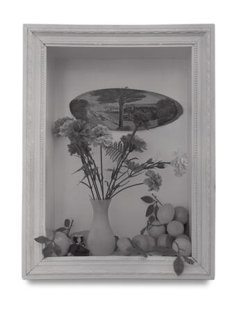 rgba(255,255,255,1) Claude GilliEx-voto (oeillets et fruits) — circa 1963Assemblage d'objets, fleurs, fruits et peinture miniature.Dimensions inconnues.© Archives Claude Gilli Demande d'information