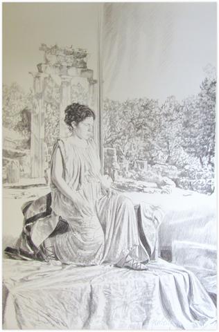 rgba(255,255,255,1) Claude GrobétyAssis tunique, deux mains posées sur les genoux, regarde en bas à gauche - 1976Dessin au fusain122 x 81 cm1976© Claude Grobéty Demande d'information