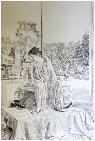 rgba(255,255,255,1) Claude GrobétyAssis tunique, deux mains posées sur stèle, regard baissé vers la droite - 1976Dessin au fusain122 x 81 cm1976© Claude Grobéty Demande d'information