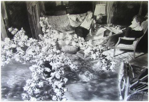 rgba(255,255,255,1) Claude GrobétyBouquet seringat, L. Voltaire, C. pouf - 1981Dessin75 x 108 cmdaté du 07.07.1981© Claude Grobéty Demande d'information