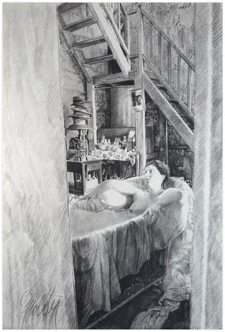 rgba(255,255,255,1) Claude GrobétyCouché, baignoire en zinc - circa 1979Dessin au fusain, signé en bas à gauche.108 x 75 cm© Claude Grobéty Demande d'information