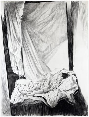 rgba(255,255,255,1) Claude GrobétyCouché robe verte sur le dos, bras droit levé, gauche étendu - 1978Dessin à la pierre noire76 x 56 cmnon daté1978© Claude Grobéty Demande d'information