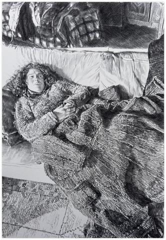 rgba(255,255,255,1) Claude GrobétyCouché sur lainage, mains croisées - 1966Dessin au fausain, daté du 29 Juin 198650 x 32 cm © Claude Grobéty Demande d'information