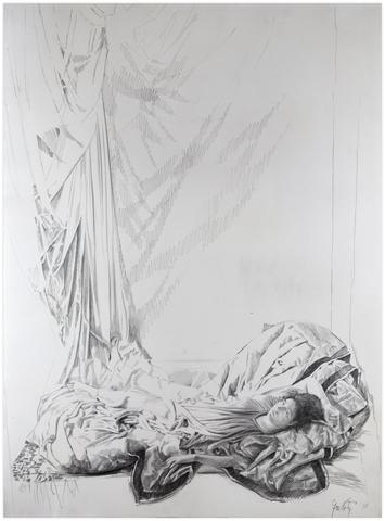 rgba(255,255,255,1) Claude GrobétyCouché sur le dos, bras droit levé, péplos - 1978Dessin au fusain76 x 56 cm1978© Claude Grobéty Demande d'information