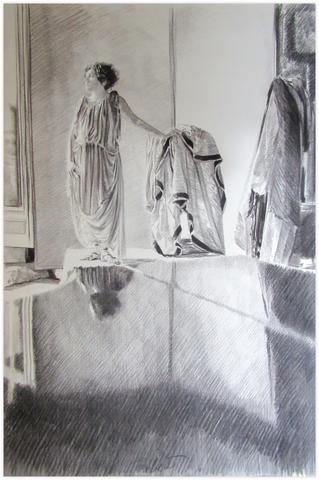 rgba(255,255,255,1) Claude GrobétyDebout, bras droit relève la tunique, gauche appuyé sur la stèle - 1979Dessin au fusain contrecollé sur carton122 x 81 cm1979© Claude Grobéty Demande d'information