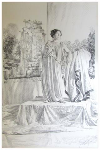 rgba(255,255,255,1) Claude GrobétyDebout tunique, accoudé stèle, avec Tholos et végétation - 1976Dessin au fusain122 x 81 cm1976 © Claude Grobéty Demande d'information