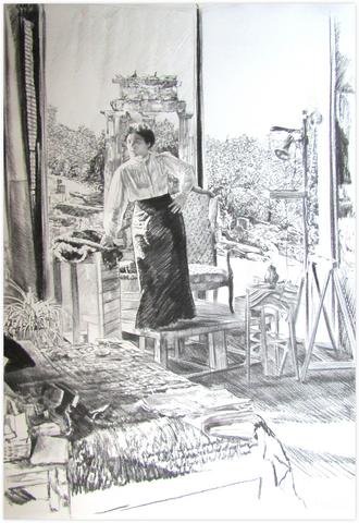 rgba(255,255,255,1) Claude GrobétyJupe victorienne devant tholos, en avant lit gris - 1977Dessin au fusain108 x 75 cm1977 © Claude Grobéty Demande d'information
