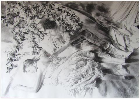 rgba(255,255,255,1) Claude GrobétyL. pose pétale sur le dos de C. - 1981Dessin au fusain75 x 108 cmdaté du 11.08.1981© Claude Grobéty Demande d'information