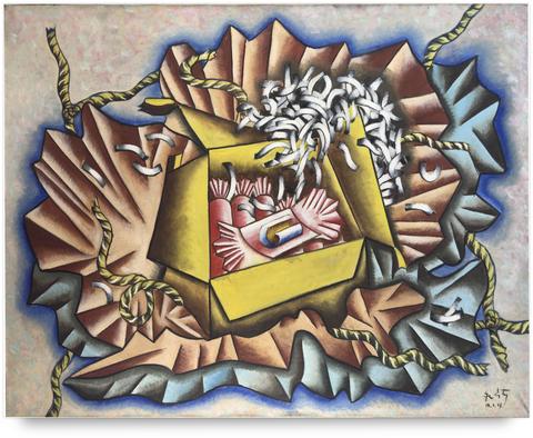 rgba(255,255,255,1) Claude GrobétyL'emballage défait - 1967Huile sur toile, datée du 14.03.1967.89 x 116 cm© Claude Grobéty Demande d'information