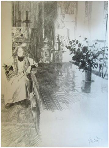 rgba(255,255,255,1) Claude GrobétyRobe blanche fourrure près table, bouquet - 1978Dessin au fusain76 x 56 cm1978© Claude Grobéty Demande d'information