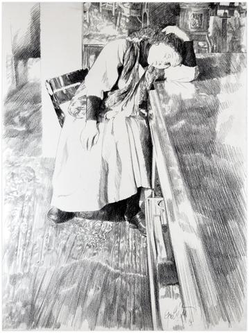 rgba(255,255,255,1) Claude GrobétyRobe blanche, tête couchée sur la table sur le bras gauche - 1979Dessin au fusain76 x 56 cm1979© Claude Grobéty Demande d'information