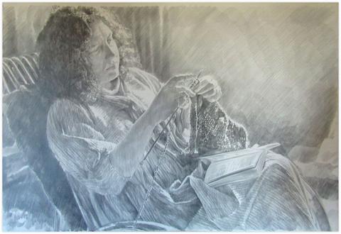 rgba(255,255,255,1) Claude GrobétyRobe blanche, tricot, livre sur les genoux - 1982Dessin à la pierre noire51 x 76 cmdaté du 20.06.1982© Claude Grobéty Demande d'information