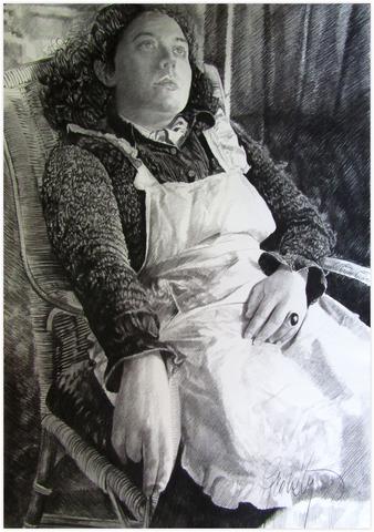 rgba(255,255,255,1) Claude GrobétyRobe chat, tablier blanc, bague noire - 1983Dessin au fusain108 x 75 cm1983© Claude Grobéty Demande d'information