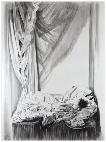 rgba(255,255,255,1) Claude GrobétyRobe verte, allongé, moustiquaire - 1978Dessin à la pierre noire76 x 56 cm1978© Claude Grobéty Demande d'information