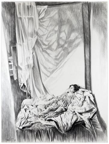 rgba(255,255,255,1) Claude GrobétyRobe verte, couché adossé à coussin, draperies - 1978Dessin au fusain76 x 56 cm1978© Claude Grobéty Demande d'information