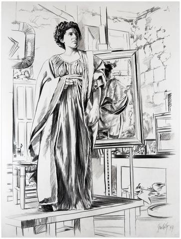 rgba(255,255,255,1) Claude GrobétyRobe verte et peplos, chignon, reflet dans le miroir - 1977Dessin à la pierre noire76 x 56 cm1977 © Claude Grobéty Demande d'information