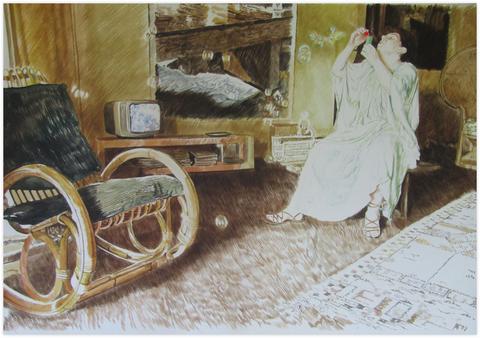 rgba(255,255,255,1) Claude GrobétyRobe verte, souffle des bulles - 1982Dessin lavis couleur52 x 74.5 cm1982© Claude Grobéty Demande d'information
