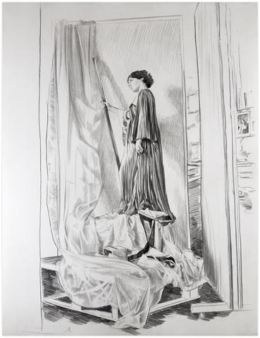 rgba(255,255,255,1) Claude GrobétyRobe violette de profil, bâton, draperies - 1978Dessin à la pierre noire76 x 56 cm1978© Claude Grobéty Demande d'information