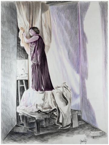 rgba(255,255,255,1) Claude GrobétyRobe violette, péplos sur estrade, draperie - 1976Dessin aux crayons de couleur76 x 56 cm1976© Claude Grobéty Demande d'information