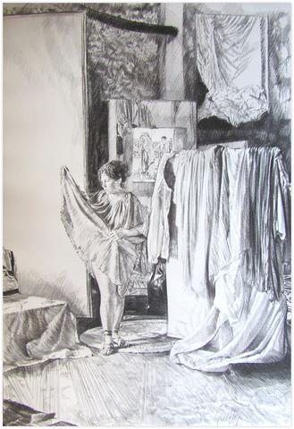 rgba(255,255,255,1) Claude GrobétySérie essayage, robe verte soulevée en aile - 1978Dessin au fusain108 x 75 cm1978© Claude Grobéty Demande d'information
