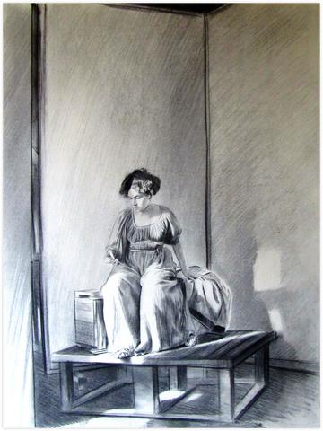 rgba(255,255,255,1) Claude GrobétyTunique sur estrade devant panneau - 1976Dessin au fusain122 x 81 cm1976© Claude Grobéty Demande d'information