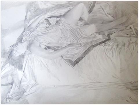 rgba(255,255,255,1) Claude GrobétyTunique, tête hors du lit, jambes nues - 1978Dessin au fusain56 x 76 cm1978© Claude Grobéty Demande d'information