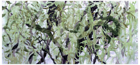 rgba(255,255,255,1) Daniel Boursin3FH green souls — 2003Lavis et peinture sur papiers assemblés, 63 x 134 cm, 2003.© Archives Daniel Boursin studio Demande d'information