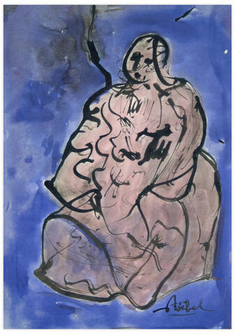rgba(255,255,255,1) Edgar Stoëbelcharacter on a blue background — encre trichlo sur papier, 21 x 29.8 cm© Edgar Stoëbel Demande d'information