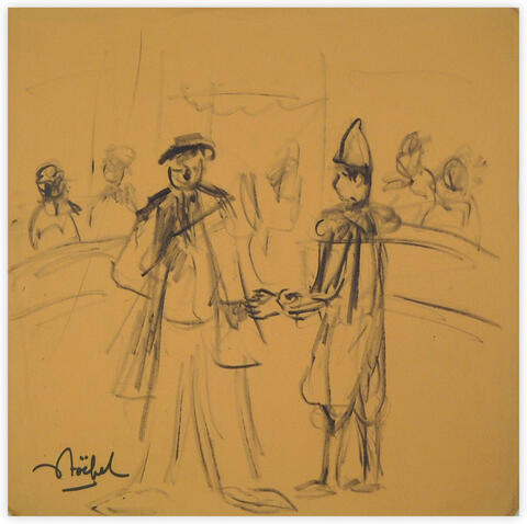 rgba(255,255,255,1) Edgar Stoëbelscène de clown — feutre sur papier orange, 35.6 x 35.6 cm© Edgar Stoëbel Demande d'information