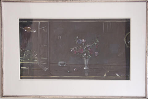 rgba(255,255,255,1) Hans SeilerBouquet à la fenêtre (gris), 1979Gouache, signée et datée en bas à droite.Collection privée© Hans Seiler archives Demande d'information