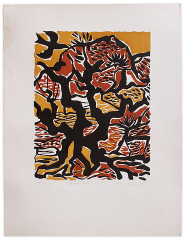 rgba(255,255,255,1) Henri BavieraARBRE-ROI — 1963Linogravure 3 couleurs sur papier Roto 250 gr., 43 x 33 cm pour une feuille de 67 x 51 cm.Tirage à 100 exemplaires. © Atelier Henri Baviera Demande d'information
