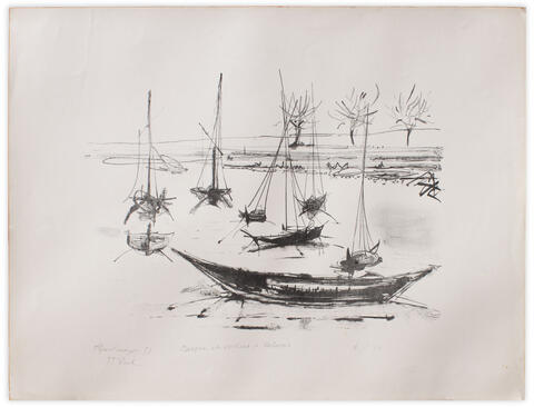 rgba(255,255,255,1) Henri BavieraBARQUES ET VOILIERS À PALAVAS — 1959Lithographie sur papier Bristol 250 gr., 33 x 46 cm pour une feuille de 51 x 56 cm. Tirage à 35 exemplaires. © Atelier Henri Baviera Demande d'information