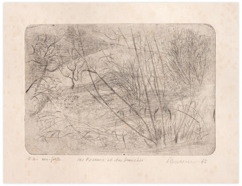 rgba(255,255,255,1) Henri BavieraDES ROSEAUX ET DES BRANCHES — 1962Gravure eau-forte sur papier d’Arches, 16 x 23 cm pour une feuille de 36 x 49 cm. Tirage à 7 exemplaires. © Atelier Henri Baviera Demande d'information