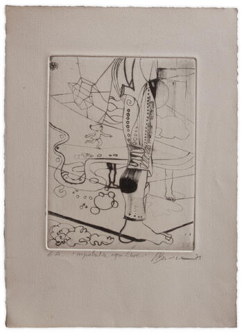 rgba(255,255,255,1) Henri BavieraIMPROBABLE ÉQUILIBRE — 1970Gravure pointe-sèche sur papier d’Arches, 23 x 18 cm pour une feuille de 38 x 28 cm. © Atelier Henri Baviera Demande d'information