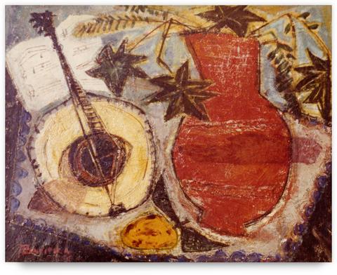 rgba(255,255,255,1) Henri BavieraMANDOLINE ET POT ROUGE — 1956Peinture à l'huile sur la toile.© Atelier Henri Baviera