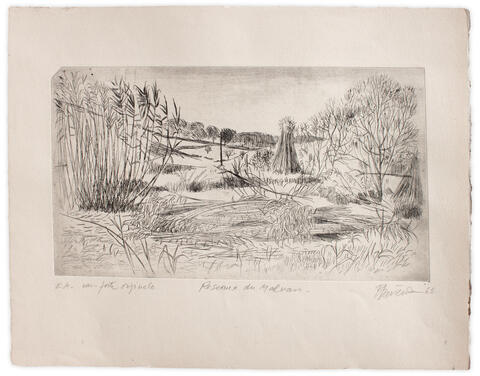rgba(255,255,255,1) Henri BavieraROSEAUX DU MALVAN — 1965Gravure eau-forte sur papier d’Arches, 15 x 26 cm pour une feuille de 25 x 32,5 cm.© Atelier Henri Baviera Demande d'information