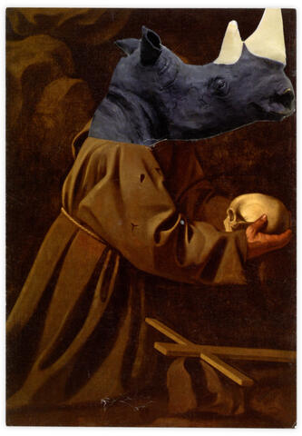 rgba(255,255,255,1) Henri FoucaultDouble jeu, Caravage - 2025Collage papier sur carte postale CaravageSaint François en méditationnan.15 x 10.5 cm© Henri Foucault Studio Demande d'information