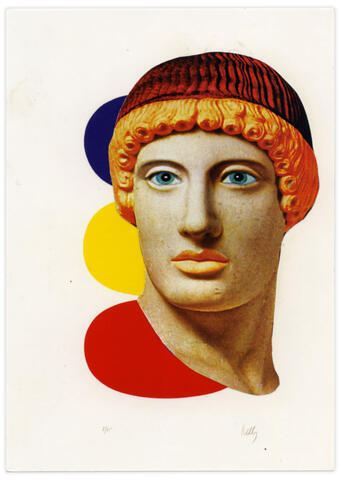 Collage papier sur carte postale Ellsworth Kelly, Bleu et jaune et rouge-orange.