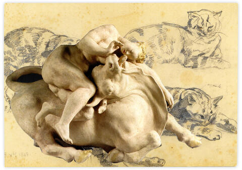 rgba(255,255,255,1) Henri FoucaultDouble jeu, Eugène Delacroix - 2025Collage papier sur carte postale Eugène Delacroixtrois études de chats allongésnan.10.5 x 15 cm© Henri Foucault Studio Demande d'information