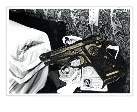 Collage papier sur le carton d'invitation de l’exposition Helmut Newton MAM de la ville de Paris. Vernissage, le 15 novembre 1984