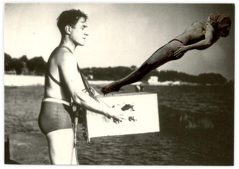 rgba(255,255,255,1) Henri FoucaultDouble jeu, Jean Painlevé - 2025Collage papier sur carte postale Jean Painlevé caméra Debrie dans son caisson étanchenan.10 x 14.5 cm© Henri Foucault Studio Demande d'information