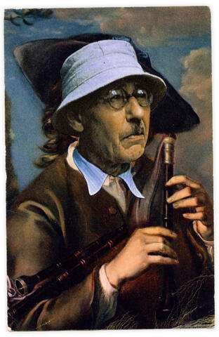rgba(255,255,255,1) Henri FoucaultDouble jeu, Philippe Mercier - 2025Collage papier sur carte postale Philippe MercierLe joueur de cornemusenan.14 x 9 cm© Henri Foucault Studio Demande d'information