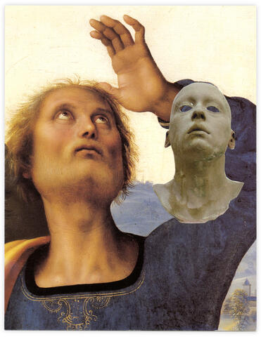 Collage papier sur le carton d’invitation Quattrocento. Musée des Beaux Arts de Lyon. Vernissage le 18 novembre 1987