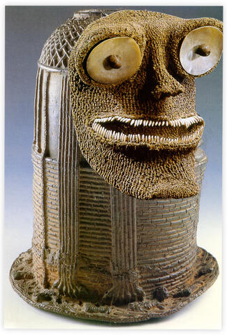 Collage papier sur carte postale Tête commémorative Musée des arts d’Afrique et d’Océanie.